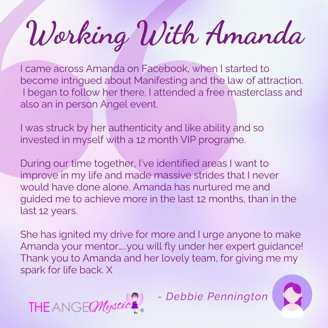 People work with me for lots of reasons, the first step is to apply by sending me a quick email to amanda@theangelmystic.co.uk I will then send you some brief questions, once you have returned your answers I will invite you to have a free chat with me to see if we can take this further and get you the results you want. There is no obligation to commit, no hard sell, just a friendly chat for approx. 30 minutes. I am only interested in supporting people I can know I can help. I pride myself on a first-class service and an awesome result. So committed clients are essential to that outcome. I will be looking to find out from yourself that you want the change and are willing to do what it takes to make it happen.